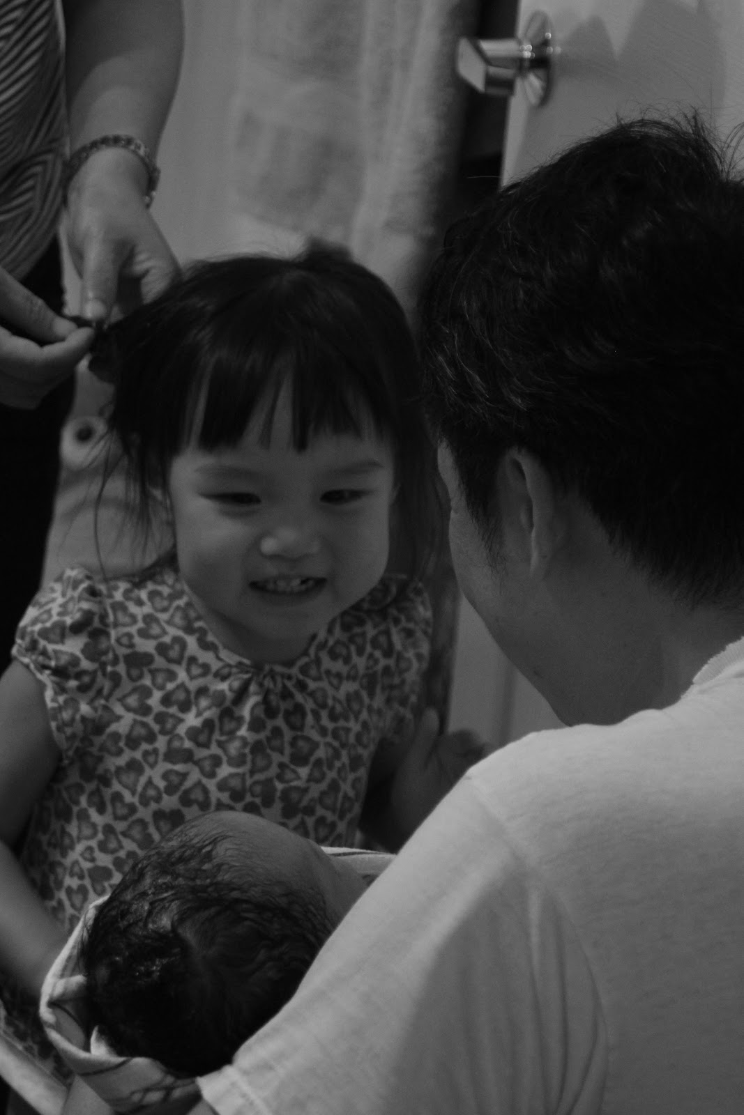 We tried to latch and nurse as soon as possible to get the natural oxytocin going to stop the bleeding. The baby was so alert. Very different from Jasmine (even with only an hour of epidural, Jasmine couldn't latch right away). I moved onto the bed. Katie nursed very strongly. She opened her eyes and looked at us. Just treasuring those moments. Jasmine wanted to meet her and she was so excited to finally see her little sister. My mom was so happy to hold Katie. Healthy 9 lbs. I had a big baby. Take that to whoever said I couldn't birth a big baby. So much for low carb diet, at least I didn't gain any weight after the baby was out. It was all baby. Both times I passed my glucose tolerance test. Someone said maybe I have a diabetic gene. Don't know if that did it. After the next few contractions, the placenta came out. I did have a third degree tear so I had to go to the hospital for suture. My doula went with me. I asked the doctor for lots of local anesthesia. To me, needles were more painful than contractions. I had a lot of gas from the pregnancy so it was embarrassing but luckily the doctor on duty was very kind.